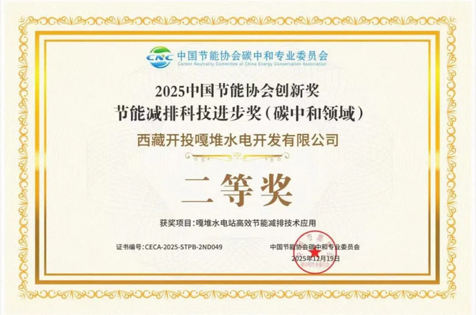 近日,中國節能協(xié)會(huì )2025年度創(chuàng )新獎獲獎名單正式公布,西藏開(kāi)投嘎堆水電公司申報的“嘎堆水電站高效節能減排技術(shù)應用”項目榮獲“節能減排科技進(jìn)步獎(碳中和領(lǐng)域) 二等獎”。