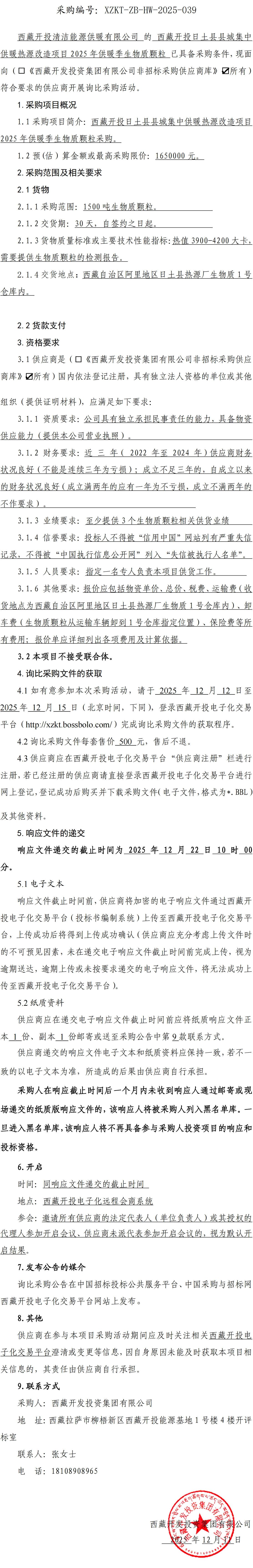 西藏開(kāi)投日土縣縣城集中供暖熱源改造項目2025年供暖季生物質(zhì)顆粒詢(xún)比采購公告